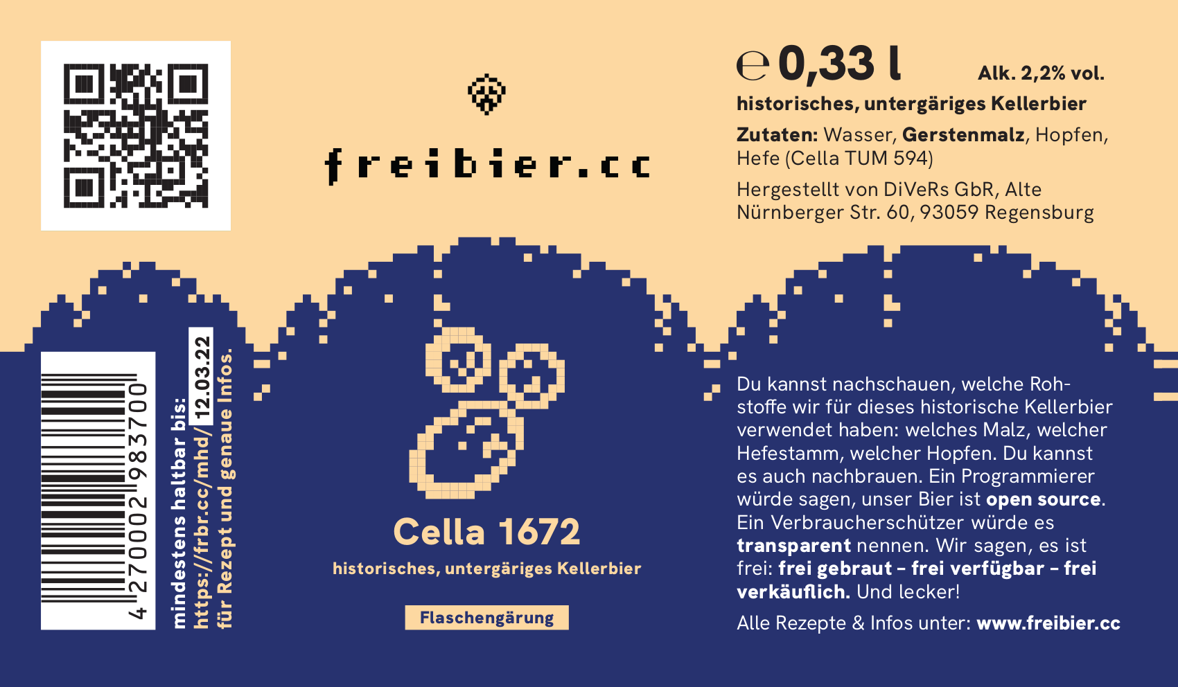 Dr. Mathias Hutzler von der TUM hat eine wilde Hybridhefe aus einer 70 Jahre alten Bierflasche isoliert. Diese Hefe, die Cella - TUM 594, ist so kältetolerant, dass man mit ihr untergärig brauen kann. Als Mathias uns fragte, ob wir zusammen mit dieser Hefe ein historisches untergäriges Kellerbier brauen wollen, haben wir ohne zu zögern zugesagt. Dann kam plötzlich Dr. Martin Zarnkow, auch von der TUM, mit einem historischen Maischverfahren von 1672 um die Ecke, und so fand eines zum anderen. Herausgekommen ist unser Cella 1672. Wir haben zwar nicht wie damals über Stroh und Holz abgeläutert, und auch entgegen dem Original eine Flaschengärung auf 3g CO2 pro l Bier gemacht, aber sind doch sehr nah dran an der historischen Vorlage. Durch die minimale Flaschengärung sind wir zwar noch nahe am originalen ungespundeten Geschmack, aber erzielen dadurch eine Haltbarkeit, die über wenige Tage hinaus geht. Selbstverständlich kam auch nur Doldenhopfen zum Einsatz. Um die alten Felsenkeller zu simulieren haben wir extra eine kleine Kühlbox gebaut, damit wir den Gärtank auf 12°C mit Raumkühlung kühlen konnten. Das Bier ist dunkel, wie damals üblich, eher leichter, mit 2,2 vol% Alkohol, dafür aber recht nahrhaft. Das Maischverfahren zusammen mit der Hefe ergibt ein Bier, das einen ganz eigenen Geschmack hat, der es aber wert ist, sich darauf einzulassen. Die Geschichte zum Bier gibt es etwas ausführlicher in unserem Blog.